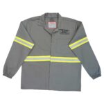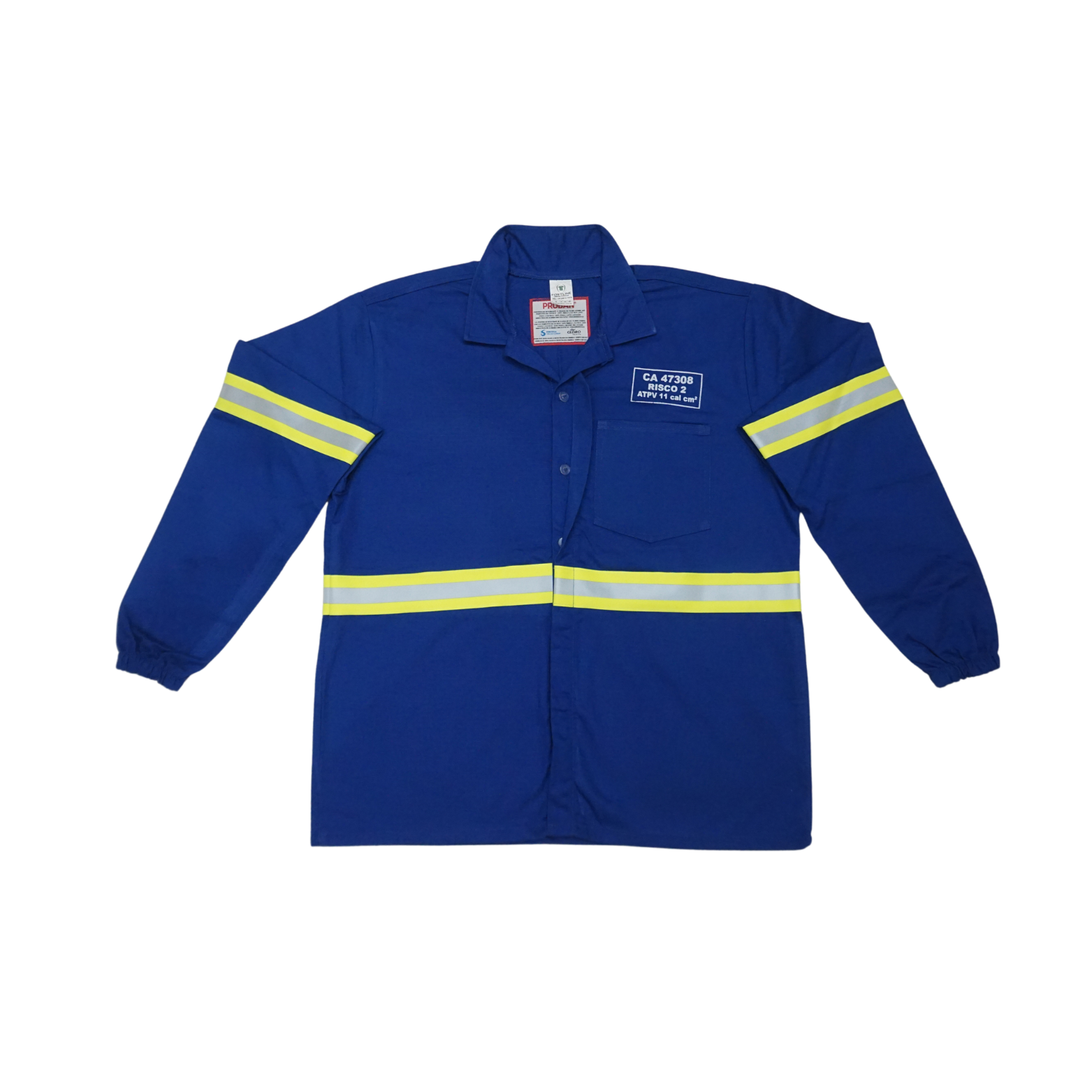Jaleco/camisa de segurança confeccionada com uma camada de tecido Cedrotech FR 100% algodão; ATPV 11 cal/cm², fabricado pela empresa Cia de Fiação e Tecidos Cedro Cachoeira S/A, com gramatura nominal de 8,6 oz/yd² (290 g/m²). Composto na região central faixas refletivas FR, duplo tecido como camada protetiva no fechamento dos botões.
